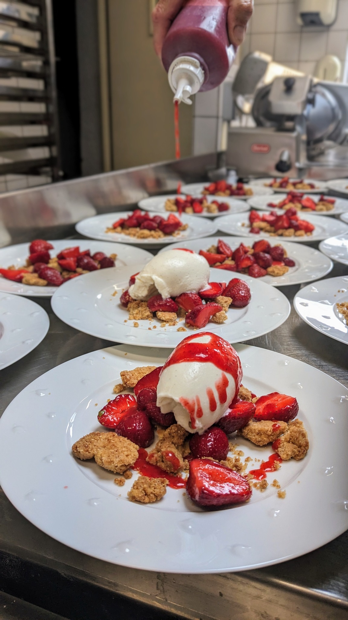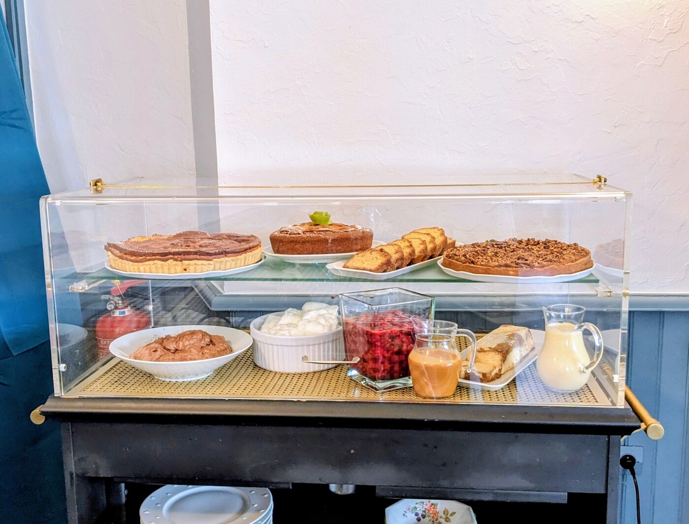 Et que dire des desserts ? C’est une véritable institution ! Un chariot de douceurs défile entre les tables : mousse au chocolat, tarte à la rhubarbe, Saint-Honoré ou Paris-Brest… sans oublier les glaces et sorbets maison, aux parfums parfois inattendus : miel de Rodemack, Plombières (spécialité au kirsch et aux fruits confits), mirabelles du jardin, fraise-basilic, rhubarbe ou encore citron du jardin de Cagnes-sur-Mer.
