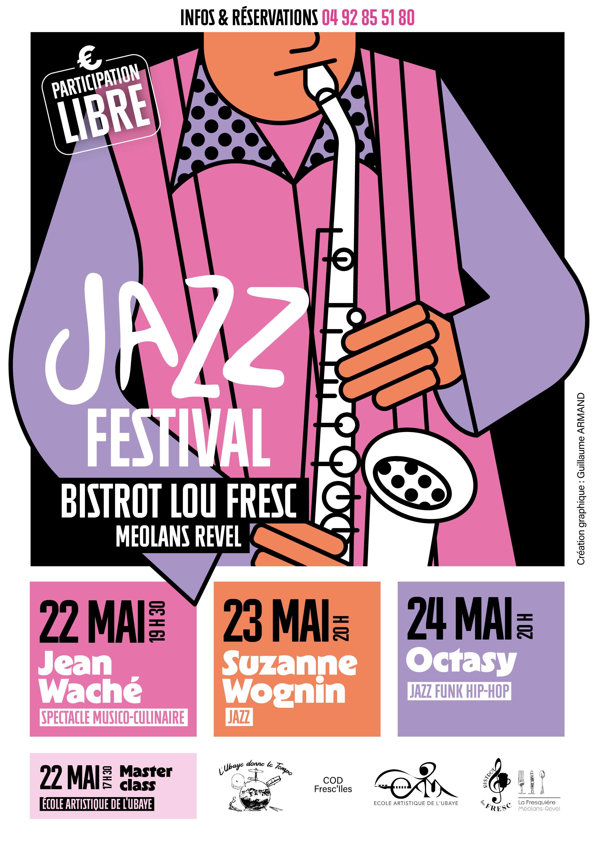 Le Jazz Festival s'installe à Lou Fresc ! Au programme : 22 mai à 17h30 : école artistique de l'Ubaye. 19h30 : Jean Waché (spectacle musico-culinaire) ; 23 mai à 20h : Suzanne Wognin (jazz) ; 24 mai à 20h : Octasy (jazz funk hip-hop). Info et réservation 04 92 85 51 80. Retrouvez le programme dans l'affiche ci-dessous.